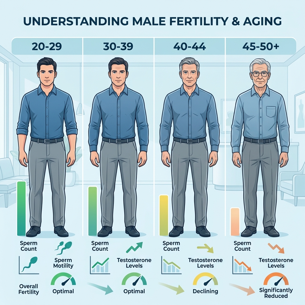 Many people believe that men can become fathers at any age without difficulty. Although men continue producing sperm throughout life, but male fertility gradually declines with age. Sperm count, sperm motility, testosterone levels, libido, and reproductive strength naturally change over time. This is why understanding the male fertility age chart is very important for couples planning pregnancy.